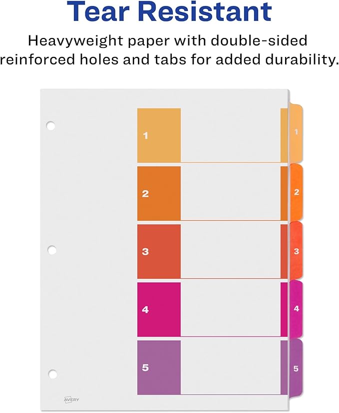 Avery 5 Tab Dividers for 3 Ring Binders, Customizable Table of Contents, Multicolor Tabs, 1 Set (11131)