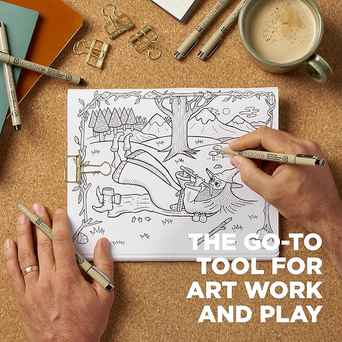 - Includes 6 black ink Pigma Micron pens in point sizes 005 (0.20mm), 01 (0.25mm), 02 (0.30mm), 03 (0.35mm), 05 (0.45mm), and 08 (0.50mm)