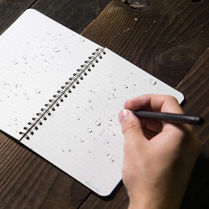 - WEATHERPROOF PAPER: 64 pages / 32 sheets per side spiral notepad. All-weather paper won’t turn to mush when wet and will repel water, sweat, grease, mud, and even survive the accidental laundry mishap. Make sure your pocket notebook stays RIGHT in the Rain.