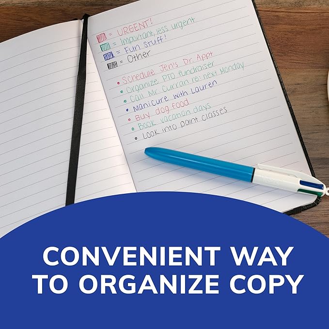 - These BIC pens feature four colors in one convenient pen: black, blue, red and green