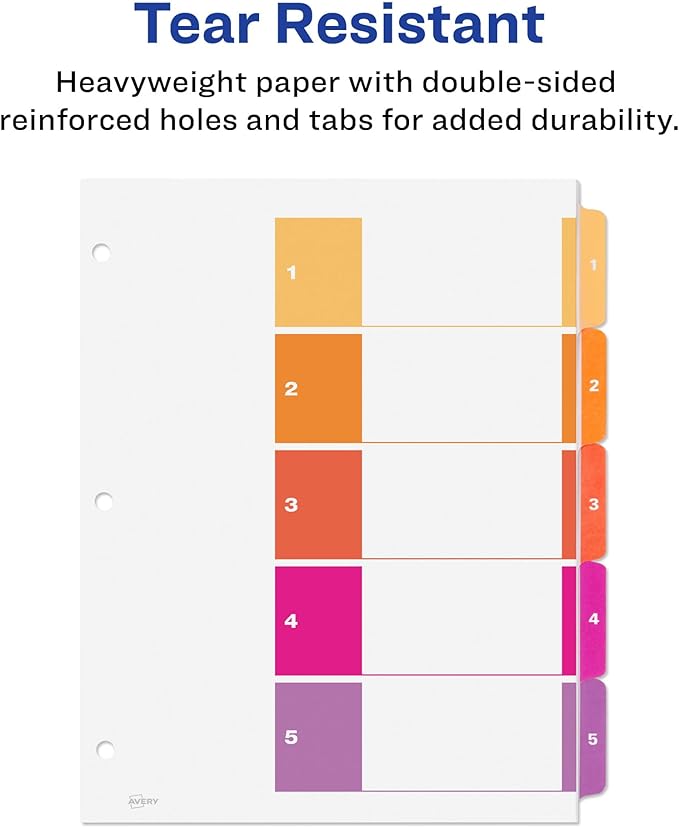 Avery 5 Tab Dividers for 3 Ring Binders, Customizable Table of Contents, Multicolor Tabs, 3 Sets (11070)