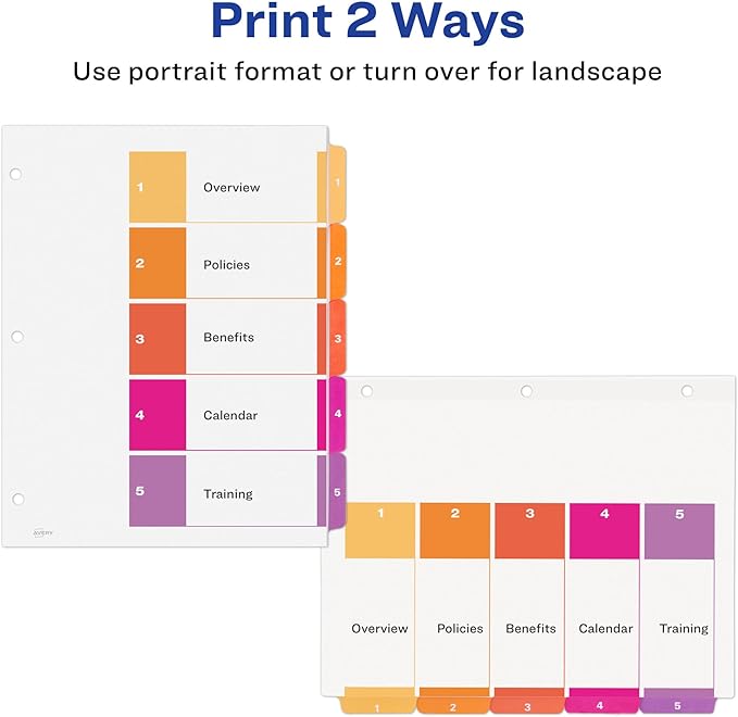 - Multicolor divider tabs are preprinted and don't require labels or inserts