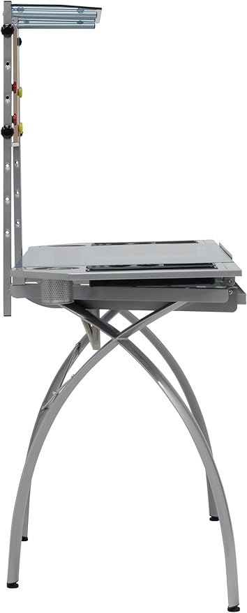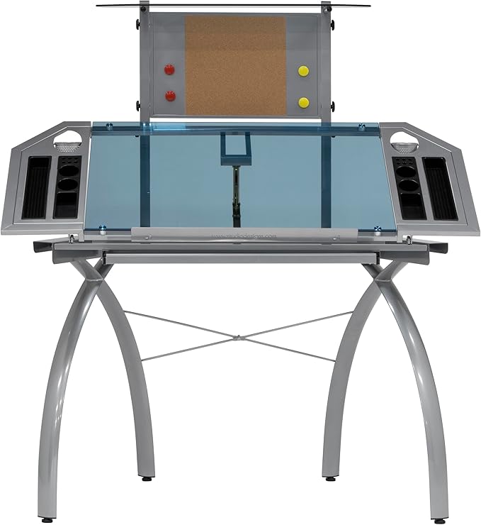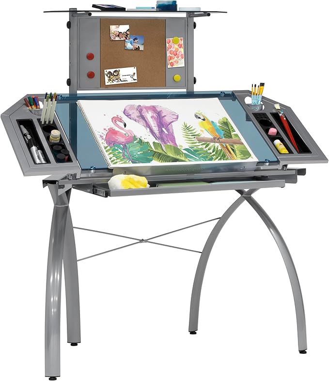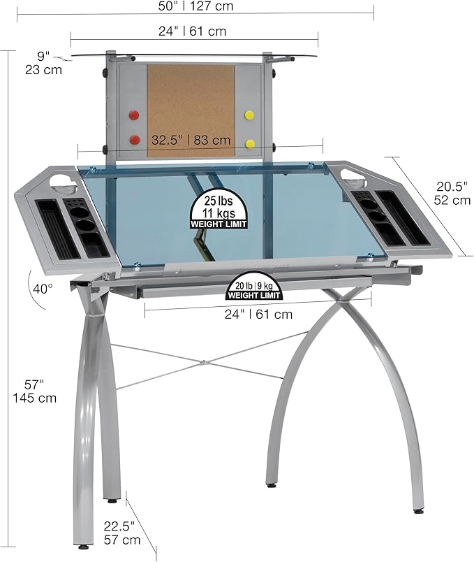 - Main Work Surface: 32. 5"W x 20. 5"D with Tempered Glass for Safety and (4) Removable Art Trays for Pens, Pencils, Brushes & Supplies