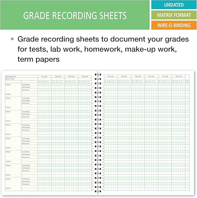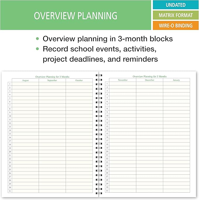 - Daily planning pages with room for 8 subjects per day, plus a homework study schedule every day, even weekends!