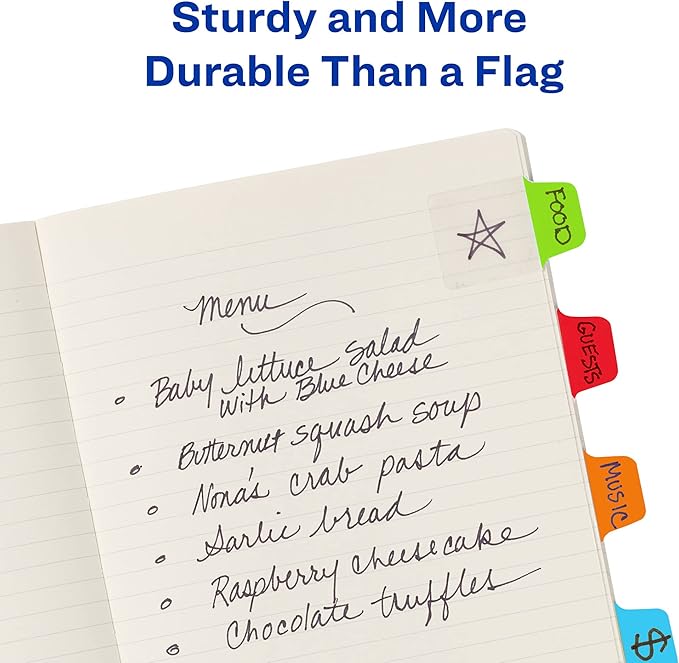 - Easily view underneath the clear page tabs body as you mark cookbooks, color code important documents, decorate planners and more