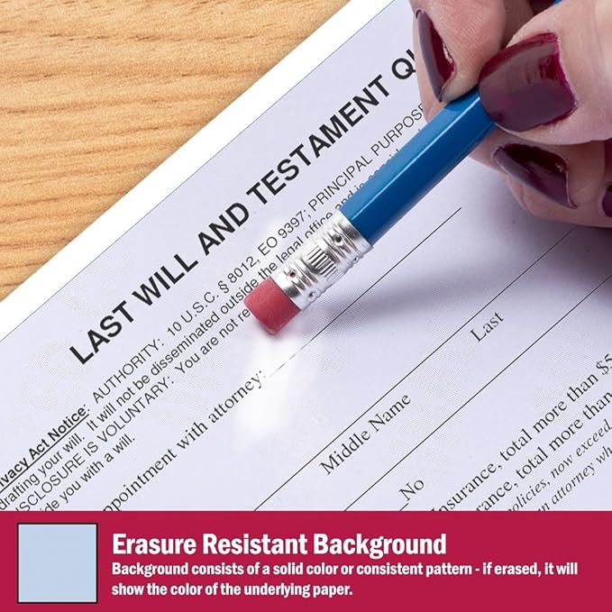 - Security paper features include: a printed artificial watermark; microtext printing which is only legible when magnified, but illegible when copied; hidden message technology (“UNAUTHORIZED COPY” appears when copied); a blue colored background that shows alterations when erased; coin reactive ink that turns black when rubbed with a coin; a shield that is printed with heat-sensitive ink and disappears when copied; and a security features listing on the front of the sheet for compliance purposes.