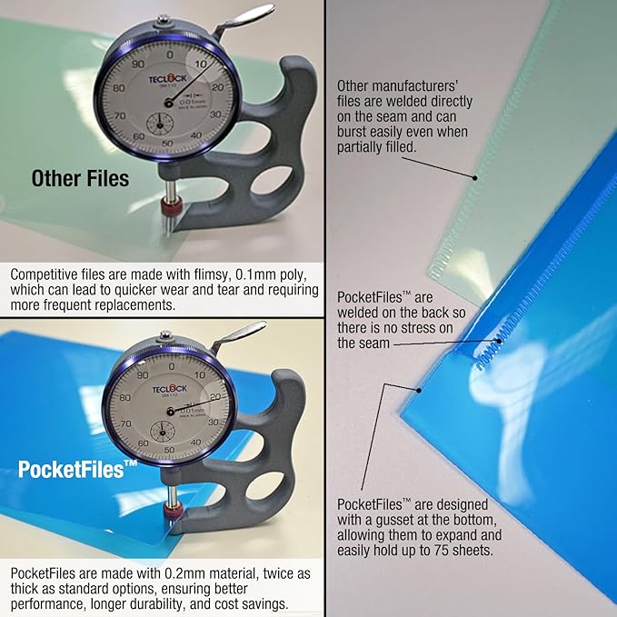 - KEEP YOUR DOCUMENTS PROTECTED - Made from durable .2mm thick polypropylene PocketFiles will protect your files from spills and debris. Each PocketFile holds up to 75 sheets.