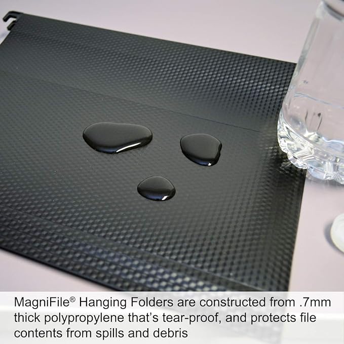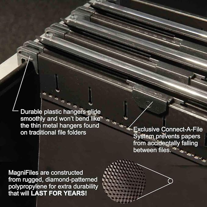 - LIFETIME GUARANTEE - Traditional hanging files are made of paper that rips, hangers that bend easily, and labels that often need replacing. All MagniFile products are constructed with spill-resistant, tear-proof, black polypropylene and come with an UNCONDITIONAL LIFETIME-GUARANTEE! BUY THEM ONCE. . .