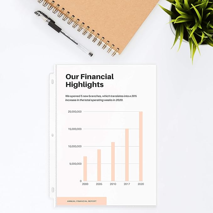 - Crystal Clear Visibilty - Top loading sheet protectors have clear finish providing optimum clarity for easy viewing of the documents. You can trust that your content will always be clear and easily readable, without the distractions caused by glare or reflections. This ensures that your materials maintain their impact and effectiveness, regardless of the setting.