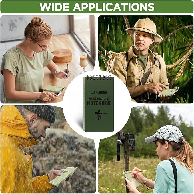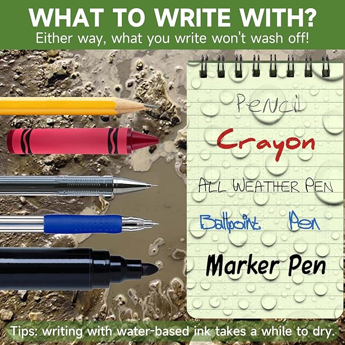 - Weatherproof Paper: 100 pages / 50 sheets per pocket notepad. All-Weather paper won’t turn to mush when wet and will repel water, sweat, grease, mud.