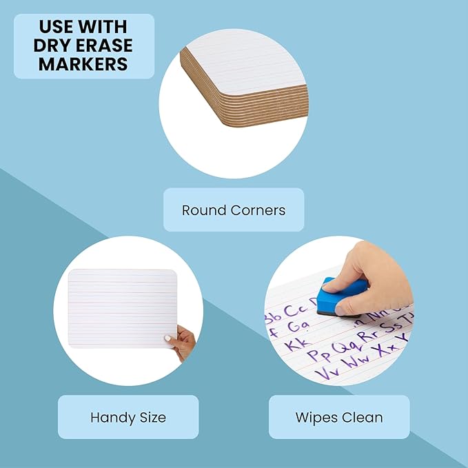- Dimensions: Each small ruled double-sided lined dry erase board measures 9 x 12 inches with rounded edges; perfect for storing in cubbies, cabinets, or desks and using them for presentations