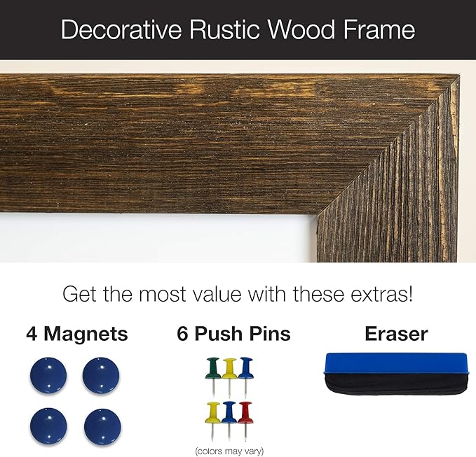 - FUNCTIONAL DECOR: This magnetic white board provides help to keep track of your busy schedule and memo. While the cork board surface keeps your notes and reminders organized. With its rustic wooden frame, it will surely add some flair to your room. This unique WOOD FRAMED Dry Erase Board offers an elegant, professional look and feel.