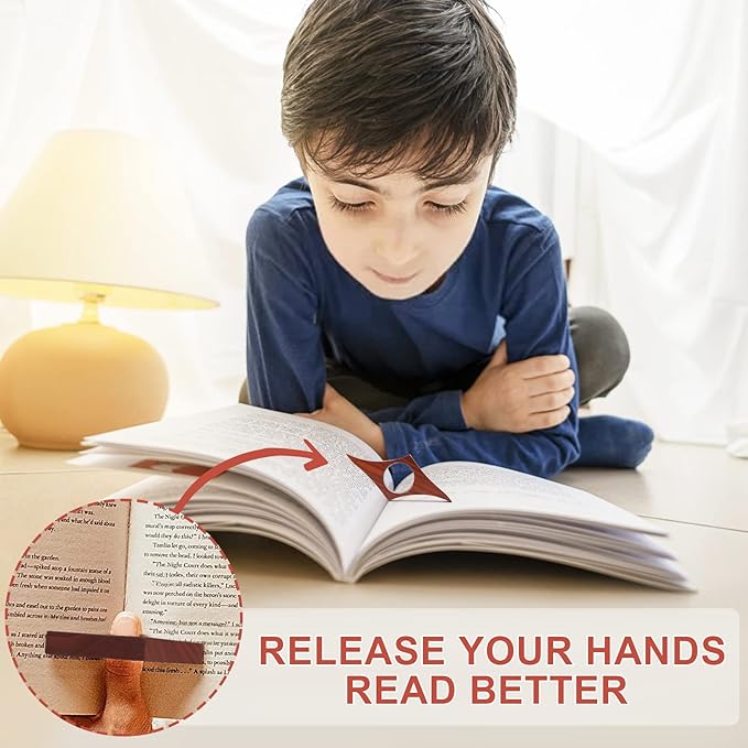- 📖 Premium Style - Lightweight, portable and compact! You can have your thumb in the middle hole, then use it to fix the pages. It is fit for both thick and thin books with glue binding! Its smooth texture and ergonomic design will keep your hand comfortable and cramp-free!