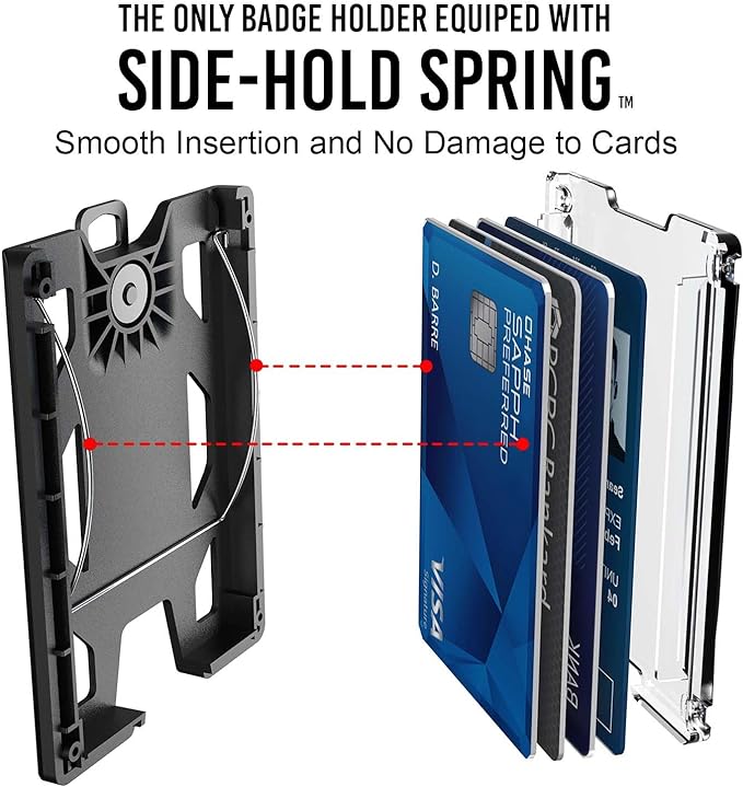 - PATENTED SPRING-LOADED CARD HOLDING SYSTEM: It holds cards well no matter it is loaded with 1 card or 4 cards. The spring holds cards on the sides so it won’t damage your cards or let them slip out. Unlike plastic retainer, metal spring does not lose elasticity.