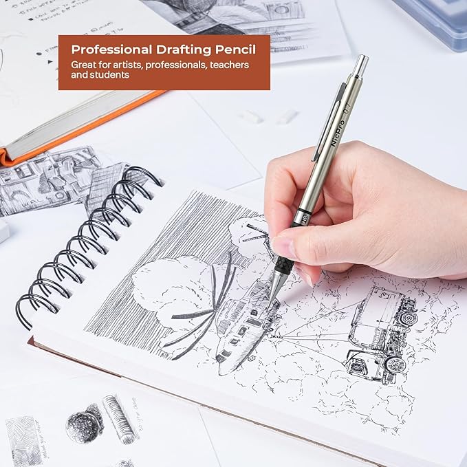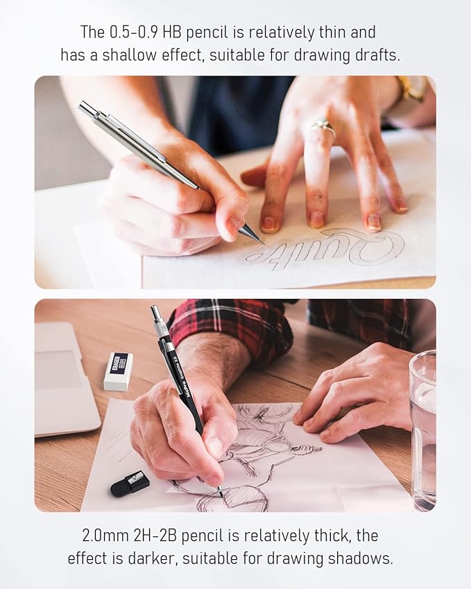 - Ergonomic, Comfortable Design :The full-metal body provides ideal weight balance for fatigue-free writing and drawing or sketching, It brings you more effective and high quality tasks. The lead advances easily at the touch of a click. There is a sharpener in the cap of 2.0 mm mechanical pencil