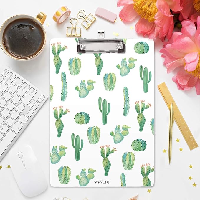WAVEYU Clipboard, Cute Clipboard, Letter Size Decorative Clipboard Cactus Design with Low Profile Clip, Retractable Key Hole for Hanging Paperboard for Office School, Cactus (12.5"x9")
