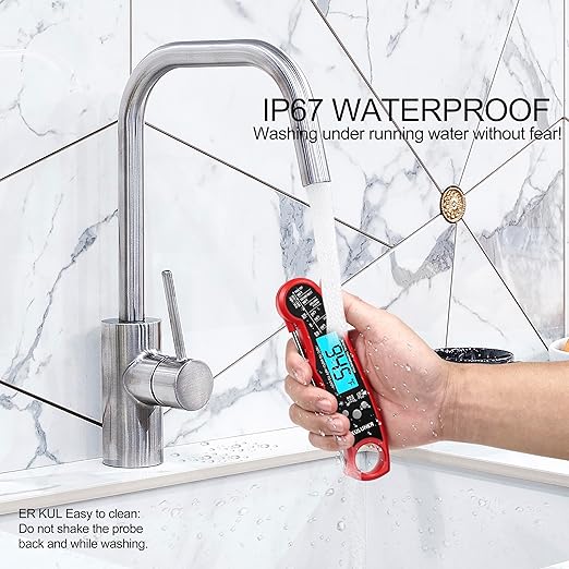 - WATERPROOF PRACTICALITY:Every gap in the thermometer has a waterproof treatment, IP67 rated waterproof, the KULUNER meat thermometer can be washed under running water without fear! With a strong ABS plastic body, it can withstand accidental drops or other impact accidents. With a waterproof and strong break resistant body, the food thermometer is highly durable and resilient. Great for grilling outdoors.