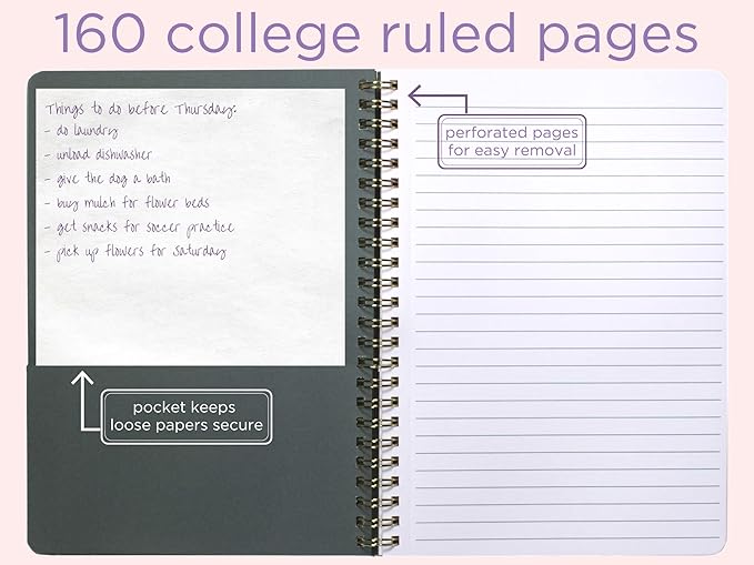 - INCLUDES 160 PAGES: Spiral notebook includes 160 high-quality, lined pages that withstand ink bleed-through; pages feature college ruled lines with a perforated edge to easily take to-dos, notes, and reminders on-the-go