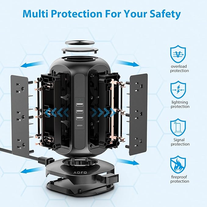 Power Strip Tower AOFO Surge Protector 12 AC Outlets with 4 USB(1 USB C) Ports Charging Station with Overload Protection, Widely Spaced Multiple Outlets with 10Ft Extension Cord for Home,Dorm & Office