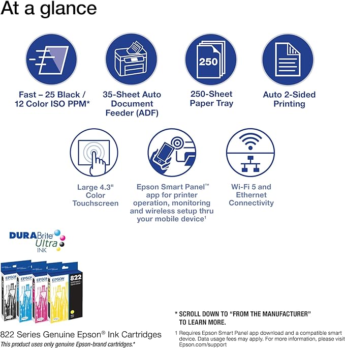 - Easy to use — 4.3" color touchscreen for quick navigation and control, plus all-new Epson Smart Panel App (1) for enhanced connectivity and productivity from your mobile device.