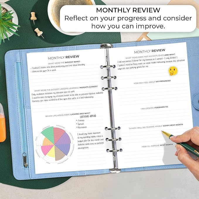 - STAY FOCUSED WITH PREMIUM LAYOUTS & MATERIALS: The life planner has an eco-leahter cover, thick 120gsm paper, and easy-to-open ring binding. Added features, such as habit trackers and regular monthly reviews, will help you improve even faster.