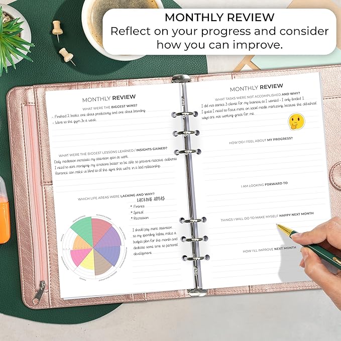 - STAY FOCUSED WITH PREMIUM LAYOUTS & MATERIALS: The life planner has an eco-leahter cover, thick 120gsm paper, and easy-to-open ring binding. Added features, such as habit trackers and regular monthly reviews, will help you improve even faster.