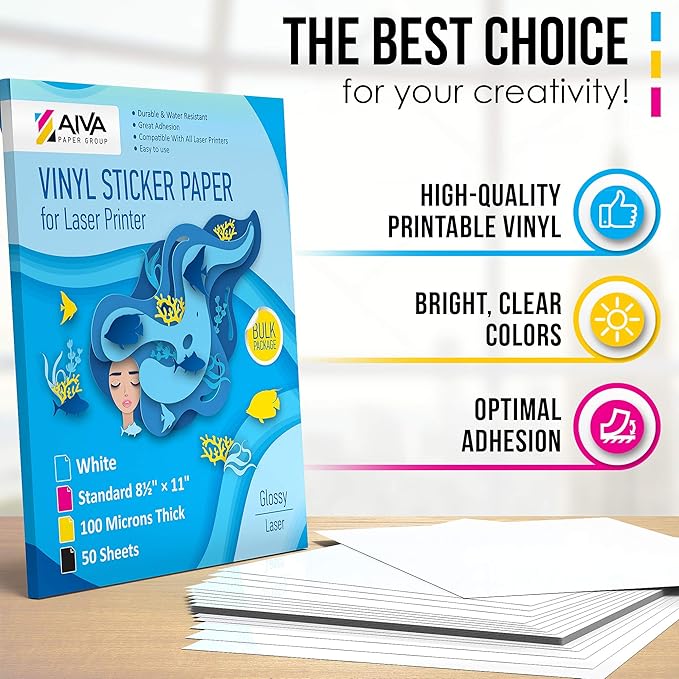 - High-Quality Printable Vinyl Paper - set includes 50 white vinyl sheets of Printable Sticker Paper for laser printer, Glossy finish. US Standard Letter Size - 8.5"x11". Suitable for High resolution and clear image quality