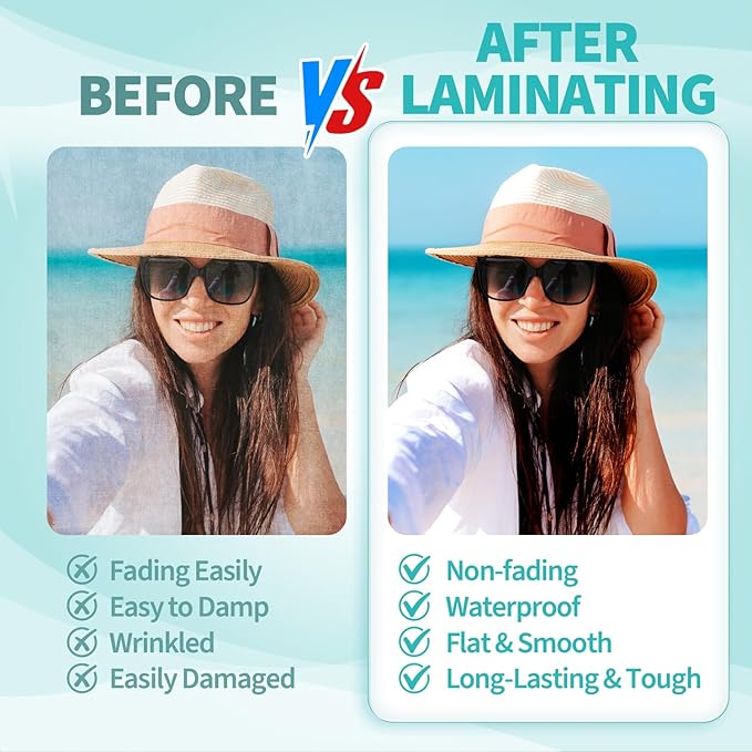 - 【High Transparency】 Made from premium PET material, these thermal laminating pouches offer a clear and glossy finish, ensuring sharp visibility for photos and documents. Designed to resist bends, creases, and dirt, they feature low haze, anti-static properties, and a wipe-clean surface, ensuring lasting clarity and protection.