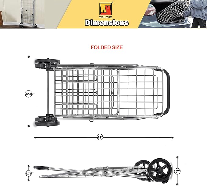 - COMPACT & LIGHTWEIGHT - This foldable shopping cart is the perfect size for any household. Lightweight yet sturdy, the Wellmax shopping cart can fit oodles of items, up to 66 lbs. Better yet, this cart is engineered to fold flat so it won’t take up valuable room your house or apartment. Functional and efficient design are two of our main priorities at Wellmax!