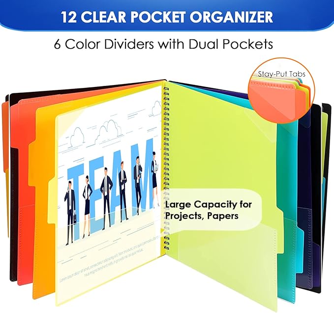 - Large Capacity Essential School Supplies- The binder organizer includes 12 pocket folders, 6 assorted dividers with 6 tabs, and 1 additional pocket on the front cover, and 1 zip pouch on the inside back cover. Dimension: 11.8 x 10 inch.
