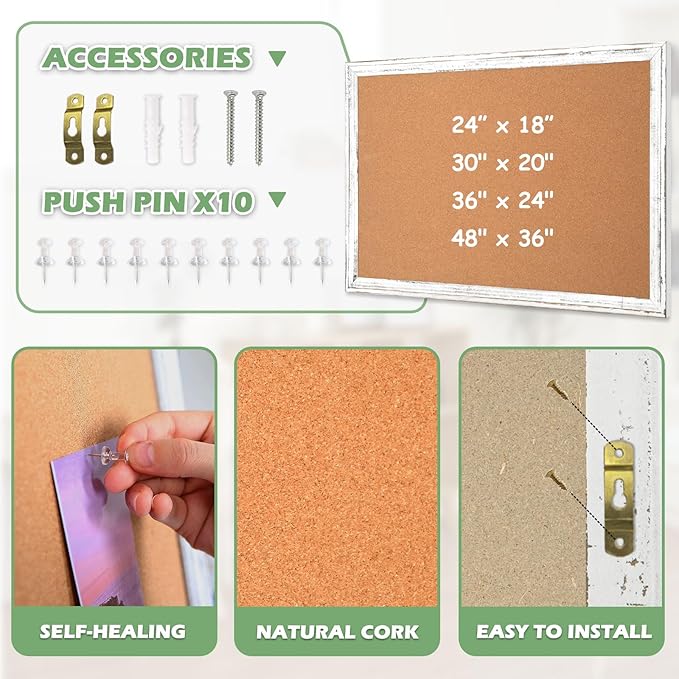 - Thick Solid Frame: Featured in a vintage-style white design, our bulletin board adds a rustic look to your room or office. Not only a bulletin board but also a perfect decoration. The thick and sturdy frame ensures a long-time use of this corkboard