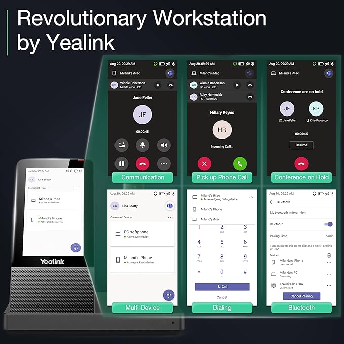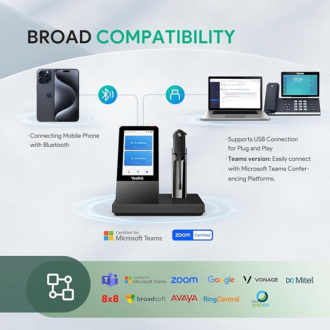 - Broad Compatibility: The Headset Base connect to PC, desk VoIP phones via included USB cable, and smartphones via Bluetooth. transfer both work calls and personal calls to the wireless headset workstation.Compatible with Yealink Desk Phones: USB Phone: T4XS/T4XU/T53/T5XW/T58A/VP59; Skype for Business Phone: T48S/T56A/T55A/T58A; Teams Phone: MP54/MP56/MP58.Poly desk phones VVX 411, VVX 401/501, VVX 250/350/450; SNOM desk phones D765 D385 D735.