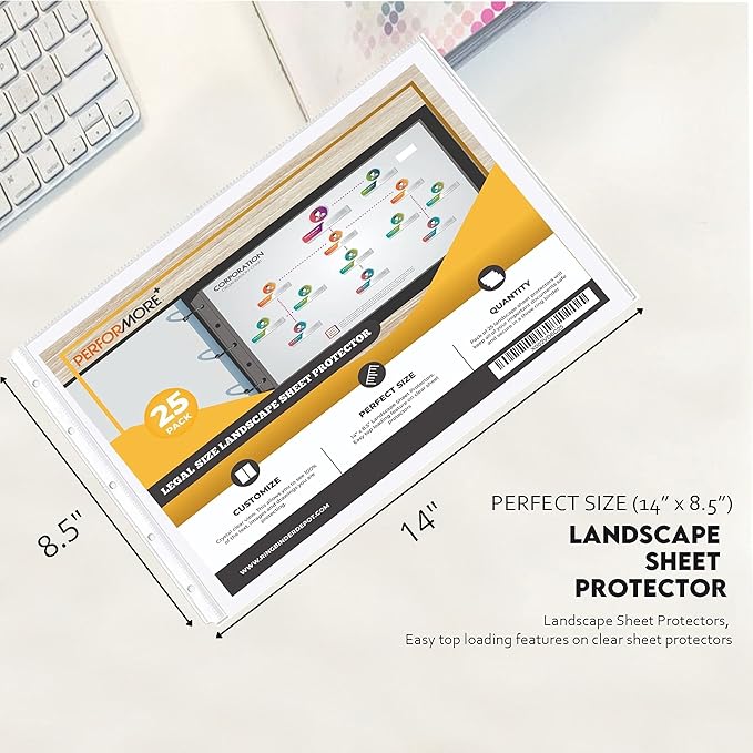 PERFORMORE 25 Pack of 8.5β x 14β Heavyweight Landscape Sheet Protectors, Legal Paper Sleeves, Clear Archival Quality, Horizontal Legal Size Clear Sheet Protectors for Binders Documents