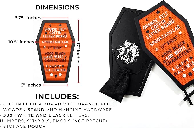 - LOOKING FOR A SPOOKY GIFT? LOOK NO FURTHER! This coffin black letter board with orange felt is perfect for year round spooky lovers that are into gothic decor, witch and vampire decor, skulls or coffin decor. Gift wrap and message available for this product at checkout!