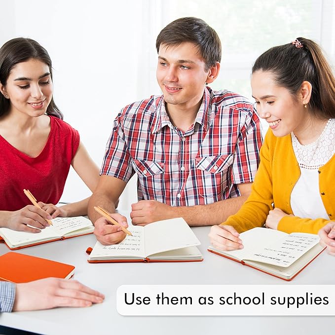 - Feela 3 Pack Classic Ruled Notebooks contains 3 classic orange ruled sturdy cover notebooks and 3 Black Retractable Pens. Each of the notebooks measures 8.3” x 5.1”, which is perfect to carry and easily held by young girls and boys. These black cute pens are customized to be placed in the pen holder, which is pretty convenient.