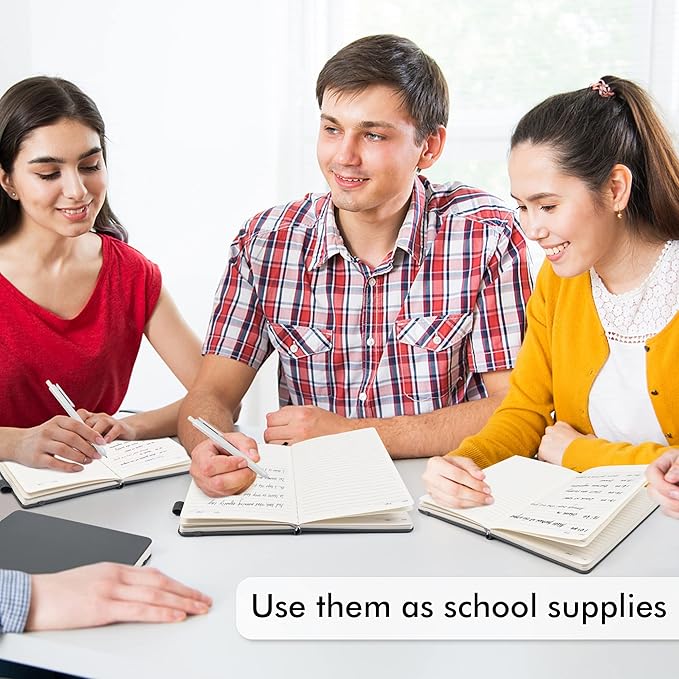 - Feela 3 Pack Classic Ruled Notebooks contains 3 classic gray ruled sturdy cover notebooks and 3 Black Retractable Pens. Each of the notebooks measures 8.3” x 5.1”, which is perfect to carry and easily held by young girls and boys. These black cute pens are customized to be placed in the pen holder, which is pretty convenient.