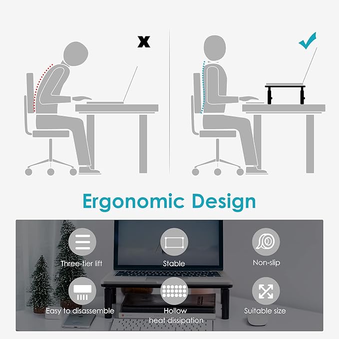 - ★ EXTREMELY STABLE & SAFE laptop stand: This monitor riser holds up to 44 lbs comes with non-slip legs & anti-skid rubber that increases stability and protects your laptop and furniture from damage. Rest assured that your device is in safe hands while you get more work done. Also it could save space for your workplace.