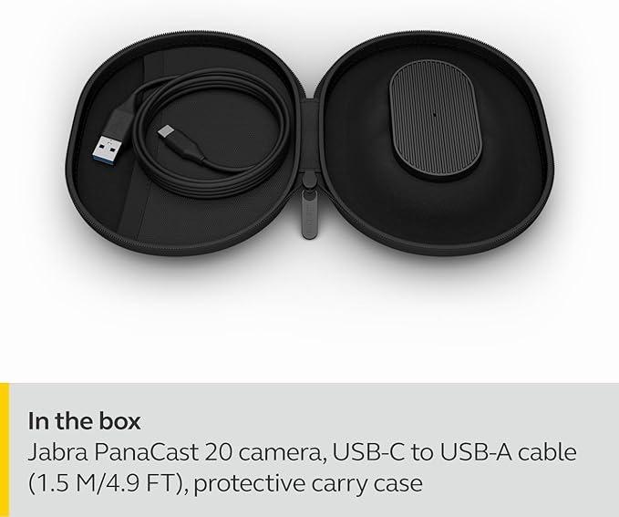 - IN THE BOX — 1x Jabra PanaCast 20 Streaming Webcam, USB-A to USB-C Cable 1.5 m/4.9 ft, 1x Protective Carry Case. Weight: 100 g