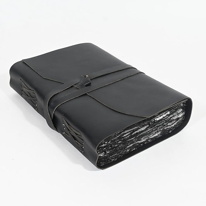 Vintage Black Leather Journal - 200 Pages Gray Deckle Edge Rustic Paper, Unlined Pages Book of Shadows, Grimoire, Junk Notebook, Fantasy Medieval Gifts, Sketchbook, Scrapbook (Raven Black, 12"x9")