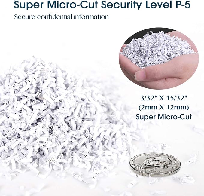 - SUPER MICRO CUT HIGH SECURITY LEVEL p5 paper shredder to secure confidential information. The paper slot blade shreds max 10-sheet paper or a credit card into particles measuring 3/32" x 15/32" (2mm x 12mm); The CD slot blade cut one CD or a credit card into 3 strip pieces