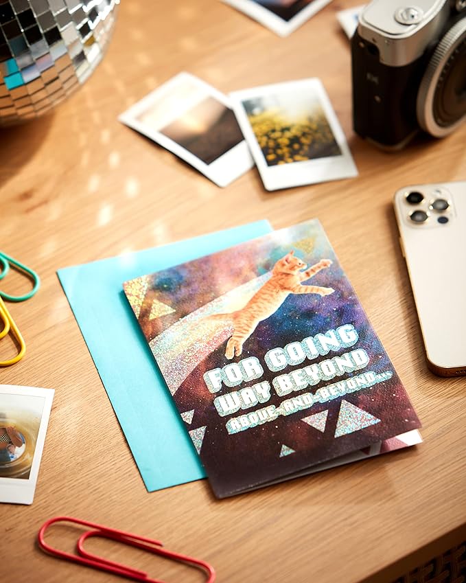 - American Greeting thank you card features an extraterrestrial design of a space cat with glitter, foil embellishments and raised detailing