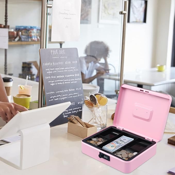 KYODOLED Metal Cash Box with Combination Lock Money Box for Cash Safe Metal Box with Money Tray for Security Lock Box 11.81"x 9.45"x 3.54" Pink X Large