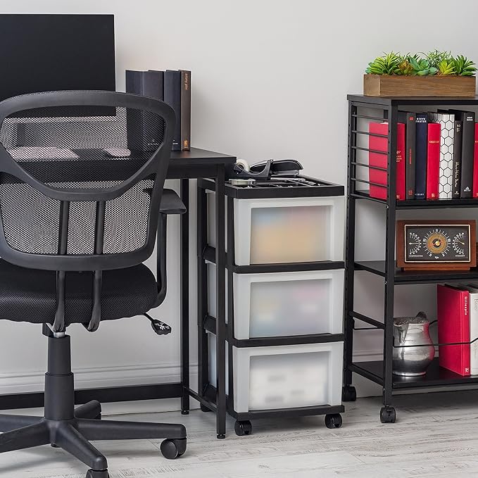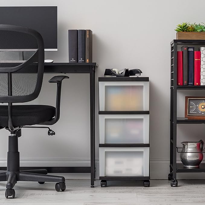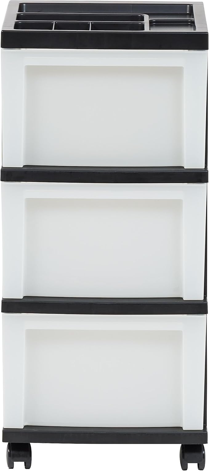IRIS USA Plastic Drawer Storage Organizer Rolling Cart, with Wheels Casters, 3-Drawers, for Classroom Art Craft Supplies Dresser Closet Bathroom Dorm Bedroom Laundry Room, Black/ Pearl