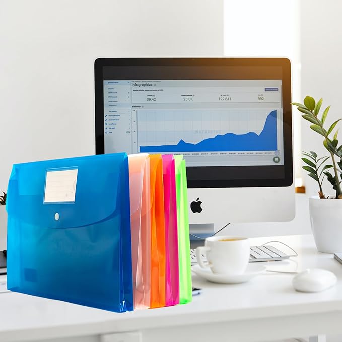 - PLASTIC FILE ENVELOPES WITH SNAP BUTTON AND LABEL POCKET: The snap button make it easier to open and close your document folder, we included a label card, label pocket make it easier to distinguish and find your documents, which will save your time and improve your working efficiency