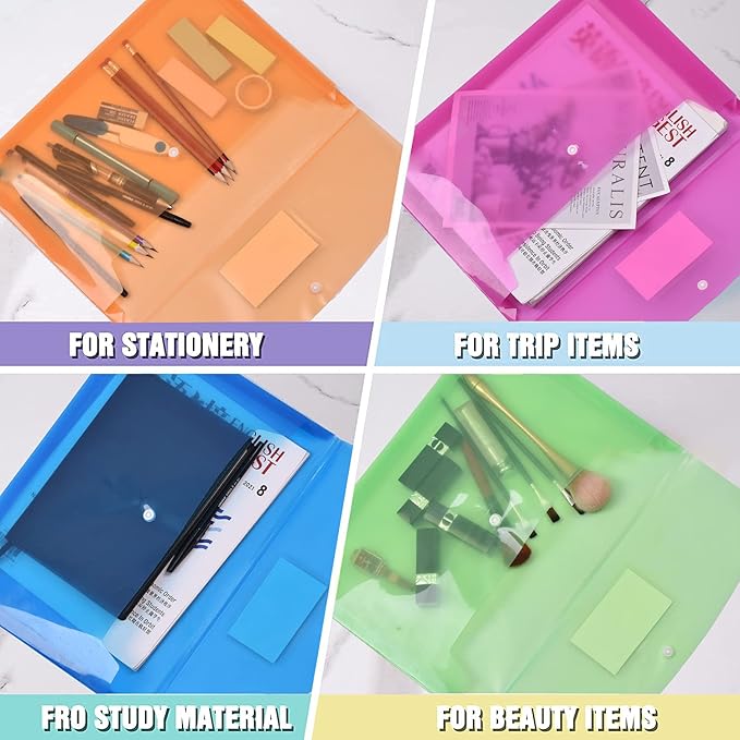 - COLORED TRANSPARENT ENVELOPES:5 assorted colors(each color with two)clear,blue, green, orange and rose red. It's easy to organize and distinguish your paper with a different color.Poly envelope folder with translucent design can quickly find documents
