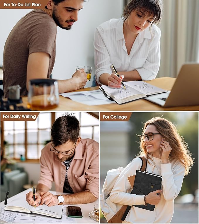 - 【PREMIUM THICK PAPER】:5.9 X 8.4 inch journal notebook with 200 pages 100 gsm lined paper, thicker 30% than normal, this black notebook is designed to avoid feathering and the paper is ink-proof, suit for most pens, but the wettest pen inks. Archival-quality pages made from acid-free paper-resists damage from light and air, the cream paper is easy on eyes.Let your creation more freedom on the wide ruled journal to write in.