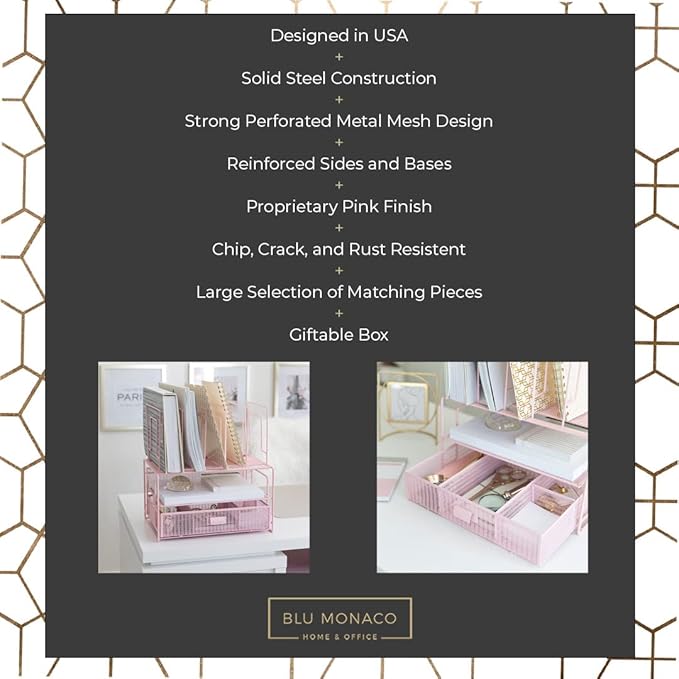 - MODERN DESK ORGANIZER, SPACE SAVING DESIGN: Organization does not have to be difficult. Made of metal finished in pink and featuring a unique mesh design, this Vertical and Horizontal File and supplies organizer with drawer and letter sorter keeps things organized and saves space.