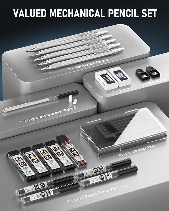 - Value Mechanical Pencils Set: The pencil set comes with 5 pcs drafting pencils(0.3mm-2.0 mm) and 4 tubes HB lead refill, 5 tubes 2.0mm refills (4B, 2H, HB, 2B, colors), 2 pcs erasers, 9 pcs eraser refills, 2 pcs lead sharpener, a gift storage box.