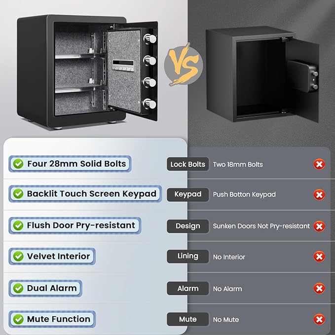 - TOTAL SECURITY, TOTAL PEACE OF MIND - Concerned about little detectives or crafty thieves? The Kavey Safe is your superior guardian! With its fortress-like low-carbon alloy steel, a 6cm-thick anti-drill door, a clever 1mm anti-pry seam, and four mighty 28mm anti-theft bolts, it's like having a personal security superhero. Keep your valuables safe from prying hands and sneaky burglars, and enjoy unparalleled peace of mind!