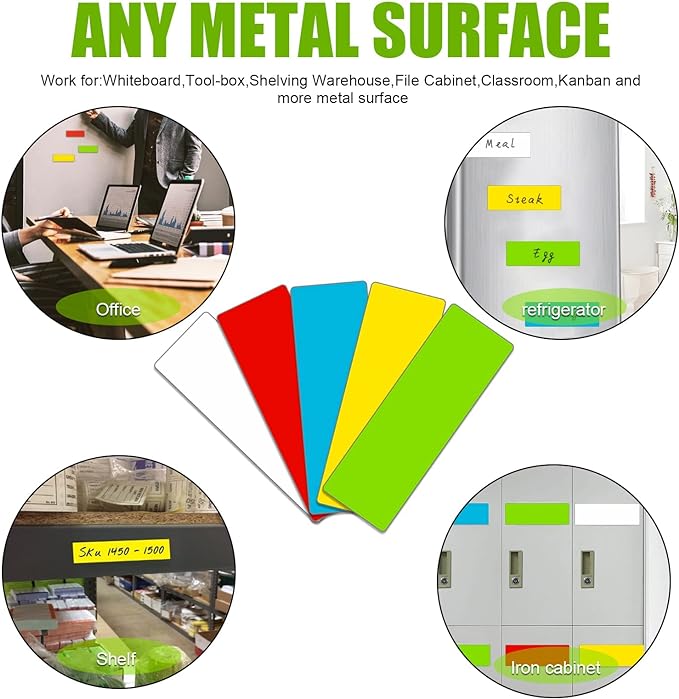 - Writable dry erase magnetic tape use for labeling storage shelves, labeling cabinets, white boards, magnet labels on the fridge, toolboxes, teaching aids, message boards, stockroom shelf labels, menu boards, planning boards, file cabinets, refrigerators, retail signs, and every other ferro metalic surface.The dry erase magnets with 260 Gauss USE DIRECT ON METALLIC SURFACE.Does not stick to stainless steel and glass whiteboard.